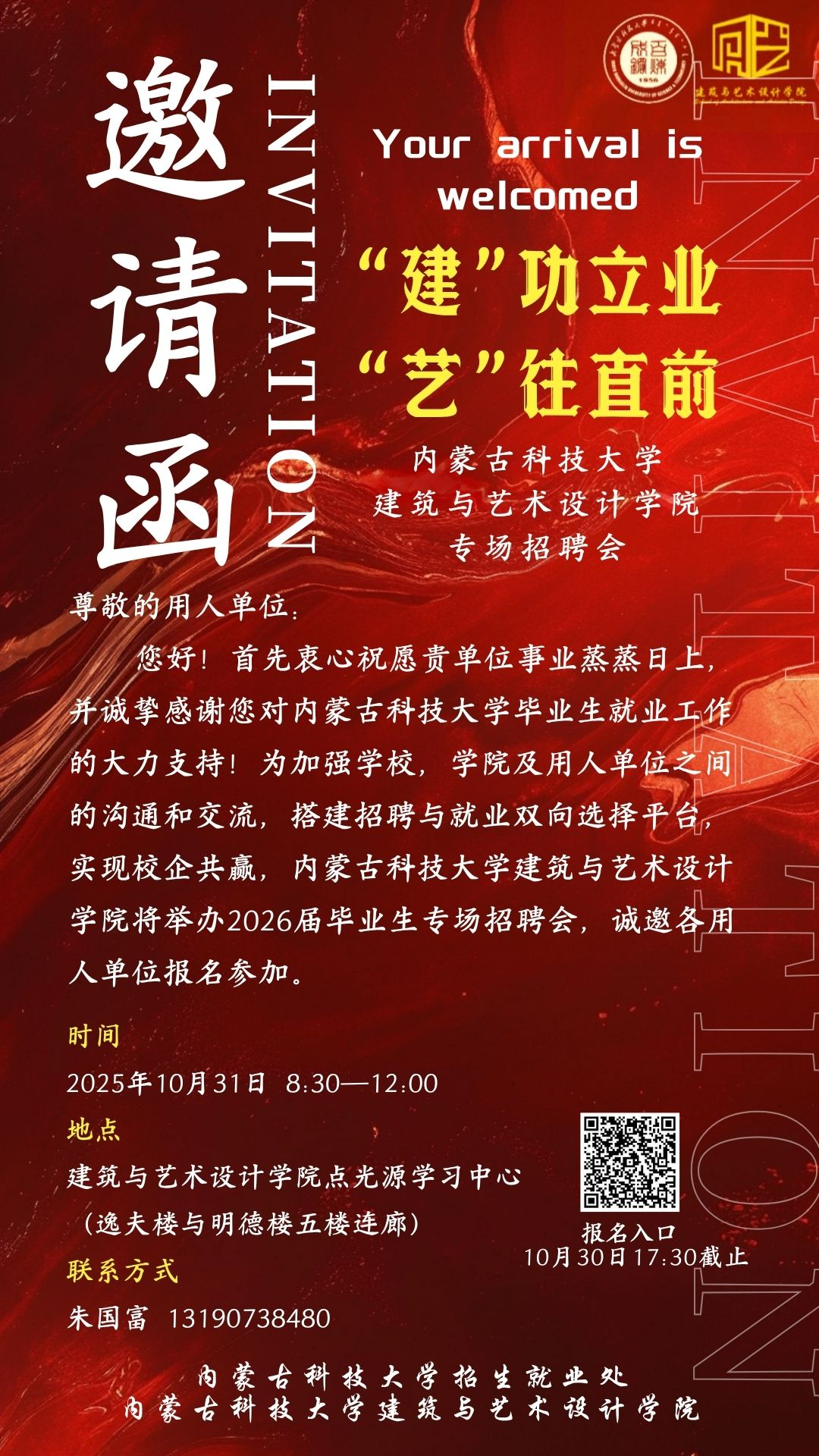 为搭建校企双向选择优质平台,实现人才精准对接与合作共赢,内蒙古科技大学建筑与艺术设计学院定于2025年10月31日8:30-12:00,在点光源学习中心(逸夫楼与明德楼五楼连廊) 举办2026届毕业生专场招聘会,诚邀各用人单位莅临甄选英才!