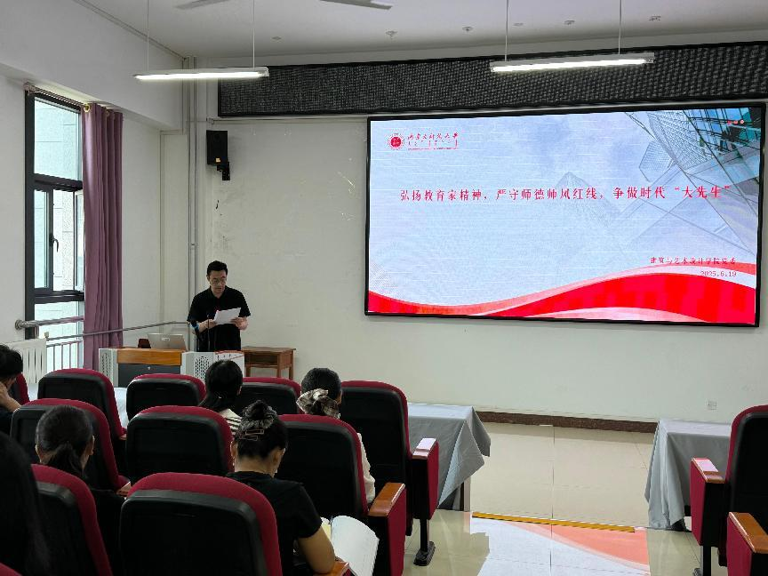 为进一步强化教师队伍建设,筑牢立德树人根基,建筑与艺术设计学院于6月19日召开全体教职工大会。会议以“弘扬教育家精神,严守师德师风红线,争做时代‘大先生’”为主题,旨在引导全体教师深刻领会教育家精神内涵,明确师德底线,勇担育人使命。