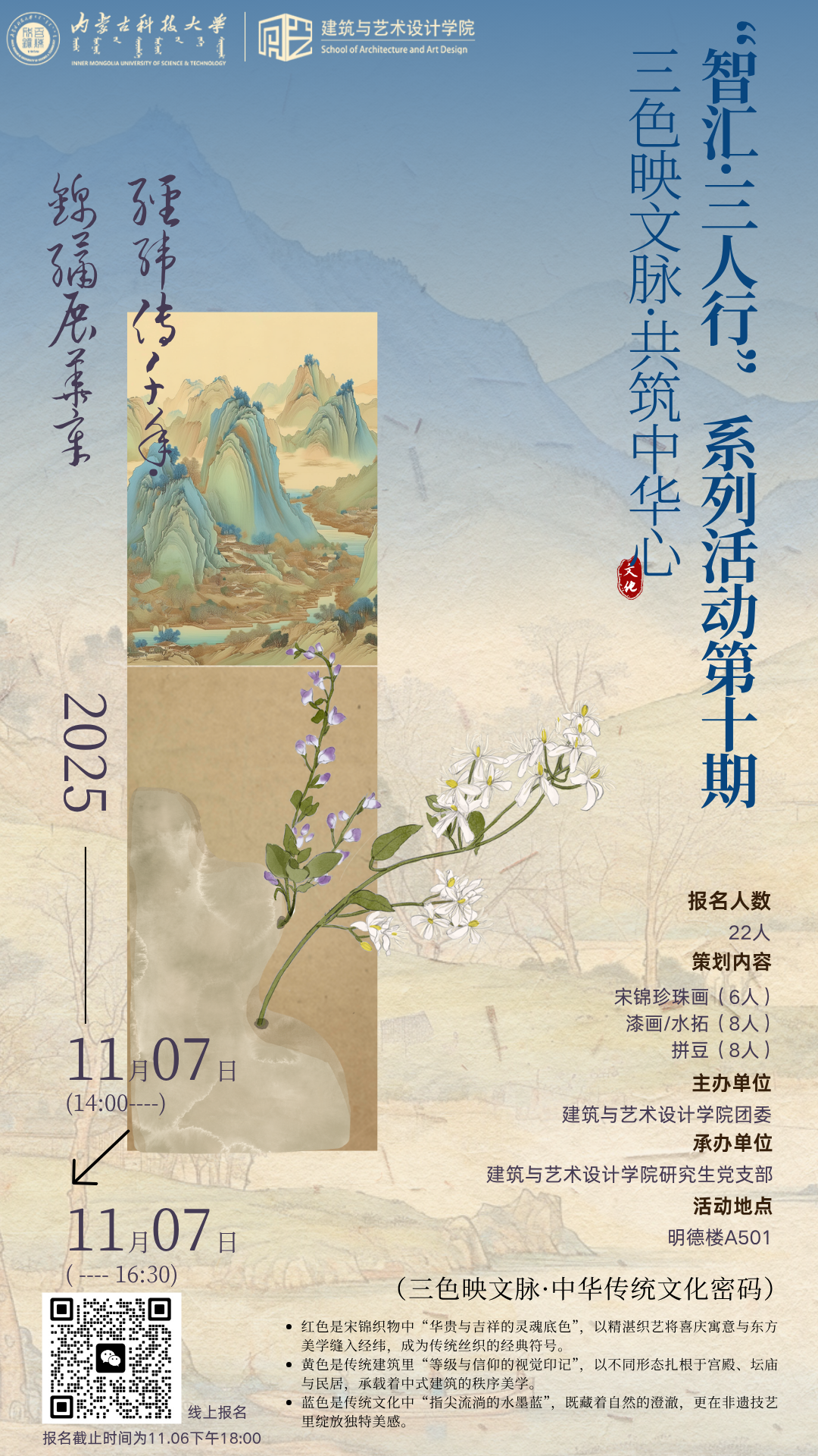 建筑与艺术设计学院“智汇·三人行”系列活动第十期 建筑与艺术设计学院团委与研究生党支部将于11月7日(14:00--16:30)在明德楼A501举办“智汇·三人行”系列活动第十期——“三色映文脉·共筑中华心”,内容涵盖宋锦珍珠画、漆画/水拓及拼豆三类传统文化体验,线上报名截止时间为11月6日18:00,欢迎同学们积极参与。