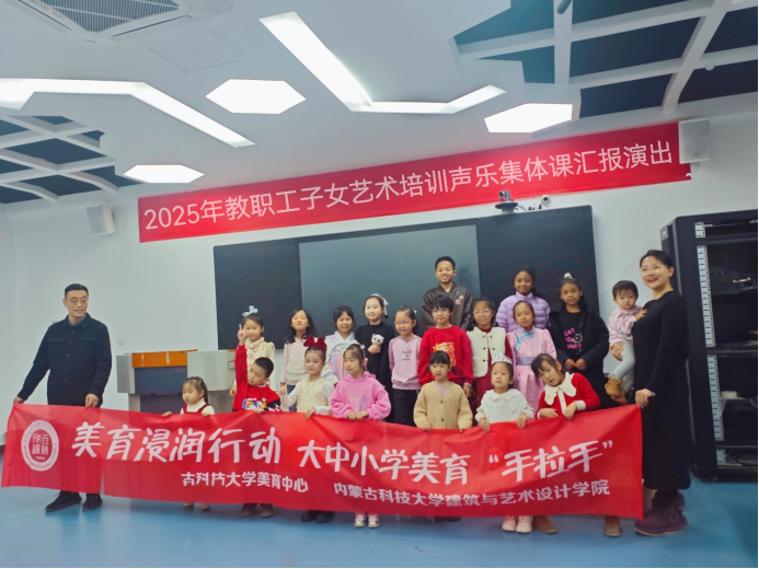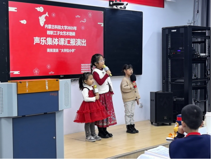 2025年12月28日15:00,由内蒙古科技大学工会、美育中心、建筑与艺术设计学院及美育名师工作室联合举办的“童声咏华章 艺韵润科大——2025年教职工子女艺术培训声乐集体课汇报演出”在明德楼H501教室悠扬启幕。20余名小学员身着节日盛装,以清澈童声接力演唱《稻香》、《听我说谢谢你》、《金色童年》等动人旋律。为现场观众献上了一场精彩纷呈的视听盛宴,更为寒冷的冬日注入融融暖意。