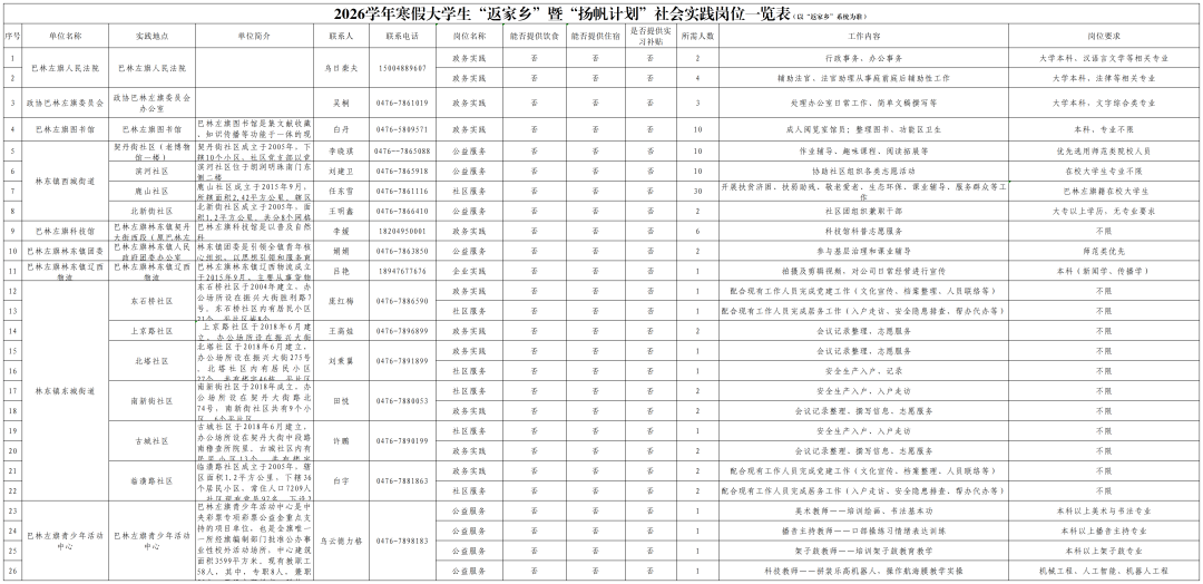 2026学年寒假大学生“返家乡”暨“扬帆计划”社会实践岗位一览表.xlsx