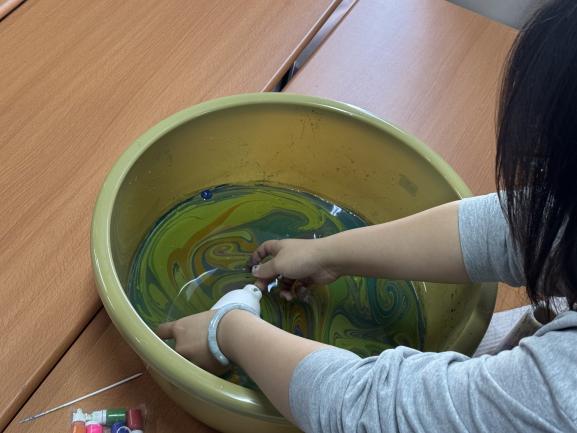 蓝色篇:“水面生韵,纸拓留痕”活动特别选择了蓝色作为主题色。蓝色这一与“水”息息相关的代表色,让色彩与媒介完美融合,引导同学们感悟水中作画的独特韵味。在活动组织人的指导下,当纸张从画液中缓缓提起,水面上流转的色彩被瞬间定格为独一无二的纹路——这一刻,既有创作带来的成就感,也有画面成形所带来的意外之喜。相较于近期热门的漆扇工艺,活动组织者特别向大家讲解了二者的核心区别。这种对介质和原理的深入探究,也引发了同学对科学研究中不同方法论与技术路径的思考。