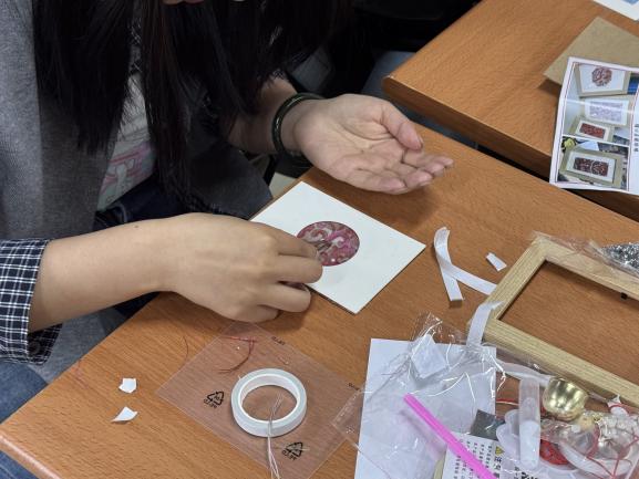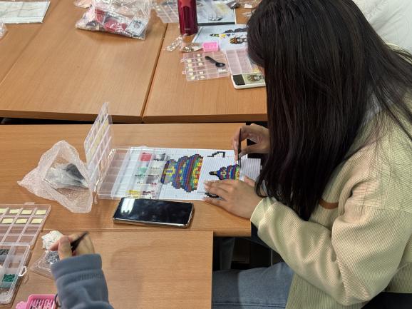 红色篇:主讲人以“宋锦里的中华美学”为主题展开分享,从“锦”字的文化内涵讲到宋锦“经纬交织”的织造秘诀,从古代皇室贡品的尊贵地位谈到当代创新应用,生动的讲解搭配实物展示,让同学们真切体会到“寸锦寸金”的技艺价值。随后,学生志愿者协助同学们进行实操教学,从图案勾勒、珍珠甄选到固定技巧,耐心解答同学们的疑问。活动现场,同学们相互交流经验、分享创意,欢声笑语中满是对传统文化的热爱与探索热情。
