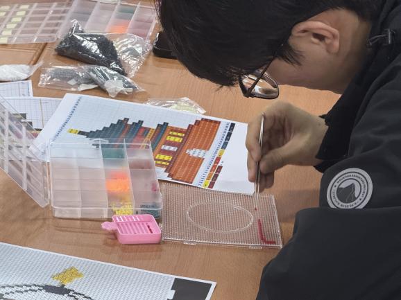 黄色篇:在“黄色·传统建筑里等级与信仰的视觉印记”板块,拼豆活动以天坛、蒙古包、钟楼为创作核心,带领同学们用彩色豆粒解构中式建筑的秩序密码。活动现场,传统建筑纹样海报与拼豆材料交相呼应,传承人先讲解天坛的坛庙礼制、蒙古包的民居智慧、钟楼的时间秩序,让大家理解建筑背后的文化深意。随后,同学们在模板引导下,将一颗颗豆粒拼接成建筑图案,在动手过程中感受榫卯般的结构美学与色彩层次。从坛庙的庄重到民居的质朴,从钟楼的规整到豆粒的灵动,大家在创意拼接中触摸建筑文脉,让传统美学在指尖焕发出青春活力。