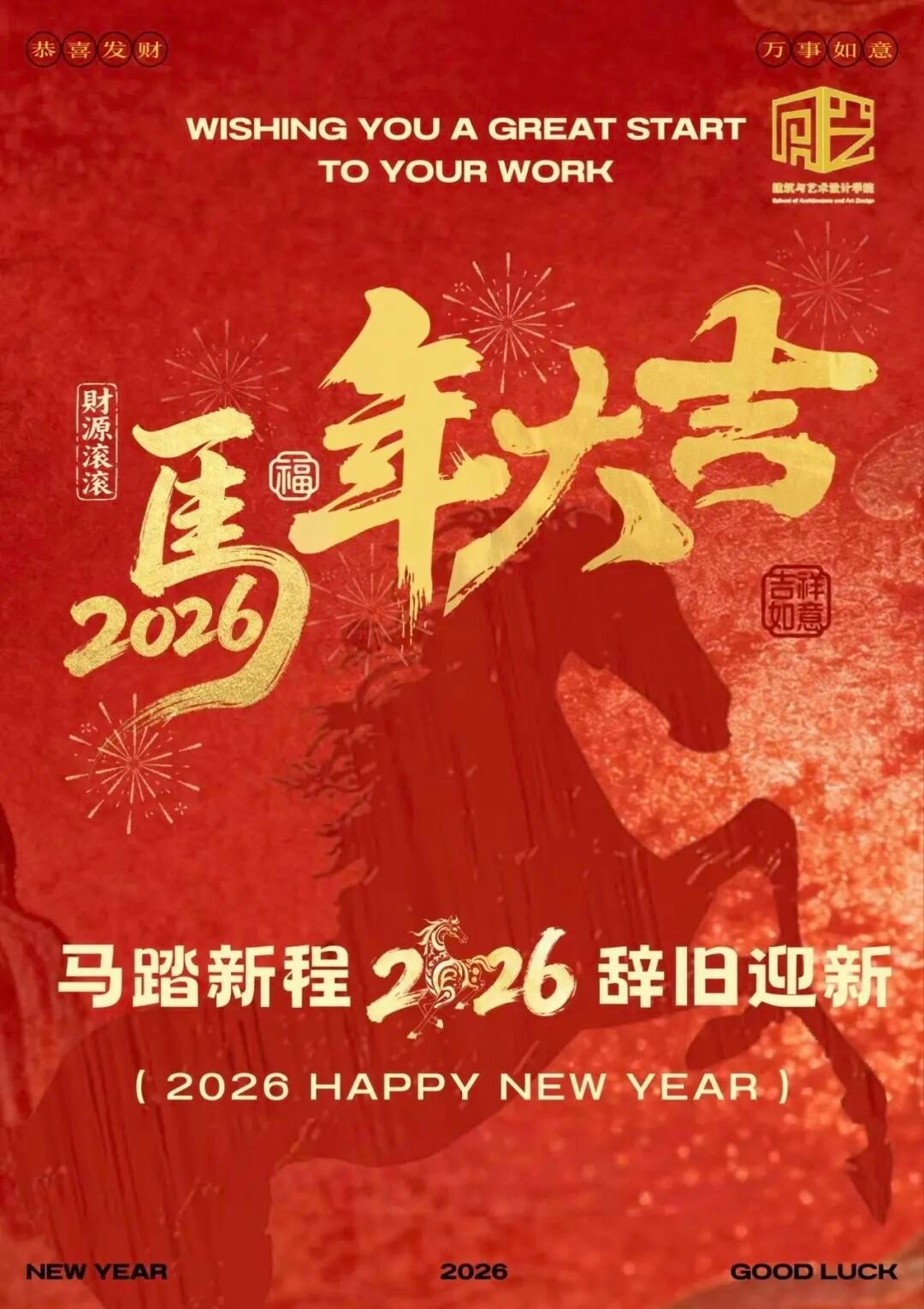 策马启新程 | 建筑与艺术设计学院给您拜年啦! 金蛇狂舞辞旧岁; 骏马奔腾迎新春; 马到成功! 鲜衣怒马少年时,不负韶华行且知。丙午马年,愿你有跨越山海的勇气,也有策马奔腾的自由。前路浩浩荡荡,万事皆可期待。