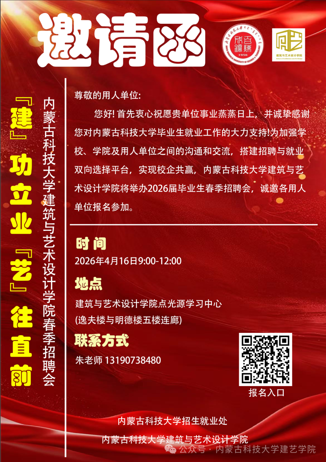“建功立业,艺往直前”| 建筑与艺术设计学院春季招聘会邀请函 建筑与艺术设计学院招聘会 筑梦职场,携手同行 诚迎八方伯乐莅临建筑与艺术设计学院2026届春季招聘会。愿以才为媒,校企携手,共谱发展新篇! 跳转链接: https://www.nmbys.cn/wechat/student
