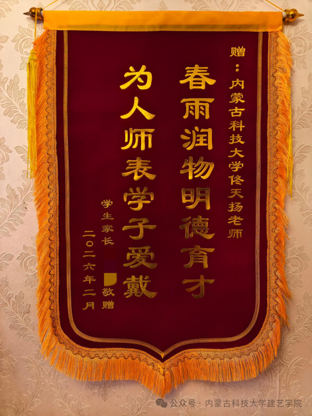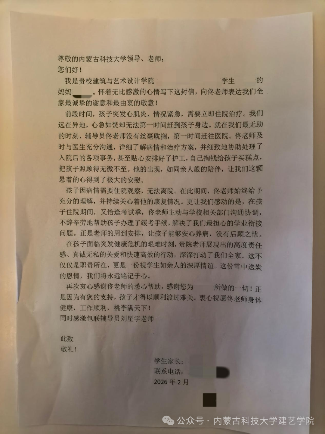 这面锦旗与这封感谢信,蕴含着家长的诚挚感激之情,更凸显了建筑与艺术设计学院“爱生如子”的育人初衷。学院始终把学生的健康成长与实际需求置于首要位置,从日常关怀到应急处理,全方位践行立德树人之使命。未来,学院将继续传承这一师者仁心,以更为细致的服务、更为温暖的关怀,为每位学生的成长成才提供保障。